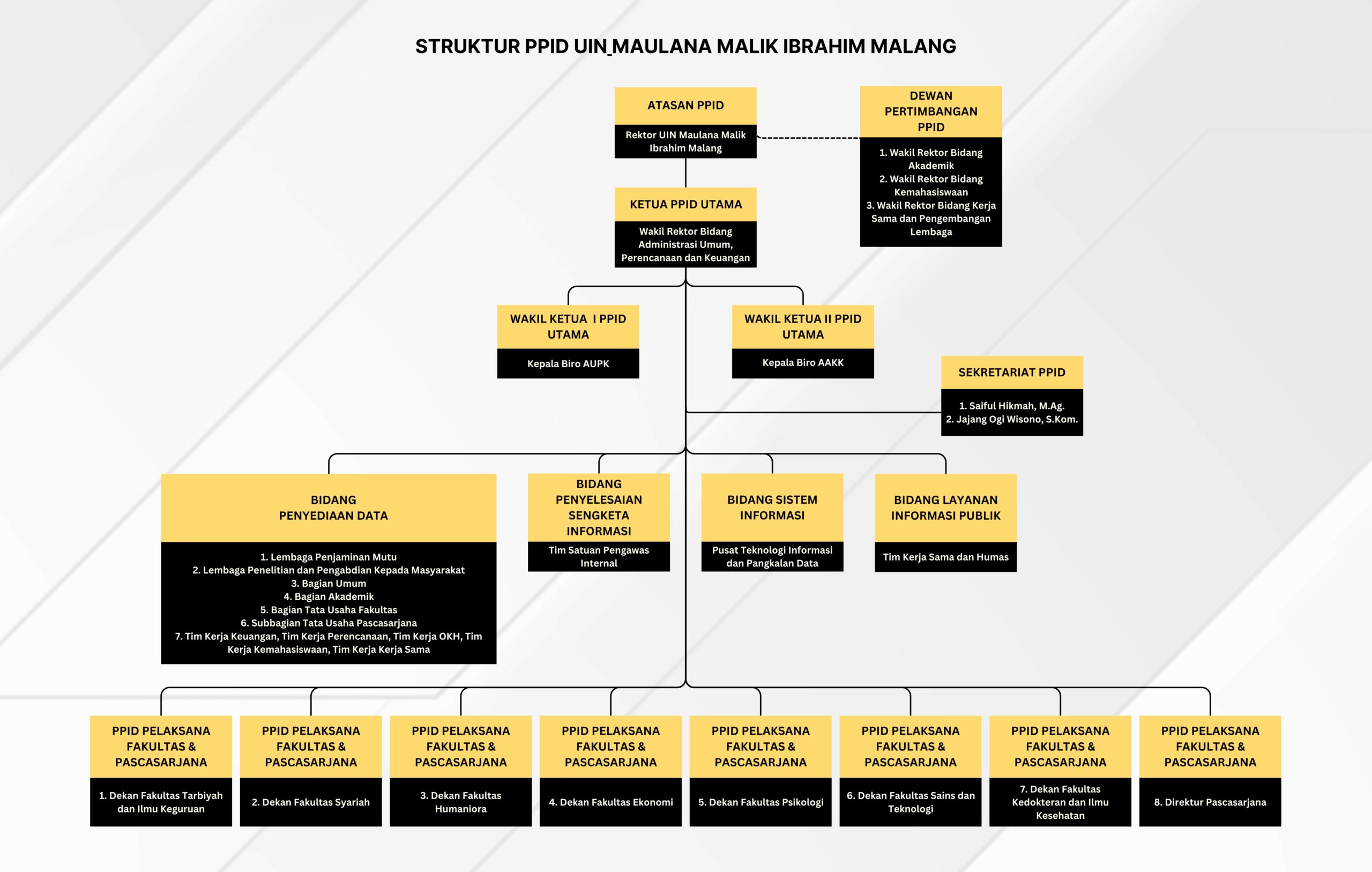 Sesuai dengan regulasi PPID UIN Maulana Malik Ibrahim Malang terdiri dari Atasan PPID yaitu Rektor, Ketua PPID dijabat oleh Wakil Rektor Bidang Administrasi Umum Perencanaan dan Keuangan, Wakil Ketua I PPID dijabat oleh Kepala Biro Administrasi Umum Perencanaan dan Keuangan, Wakil Ketua II PPID dijabat oleh Kepala Biro Administrasi Akademik, Kemahasiswaan dan Kerja Sama, PPID Pelaksana ditunjuk Kepala Pokja Kerjasama, Kelembagaan dan Humas dan Wakil PPID Pelaksana ditunjuk Pusat Teknologi Informasi dan Pangkalan Data. Selain itu dalam struktur PPID terdapat tiga divisi yang meliputi Divisi Layanan Informasi, Divisi Pengaduan dan Sengketa, dan Divisi Penyedia dan Pengolahan Data